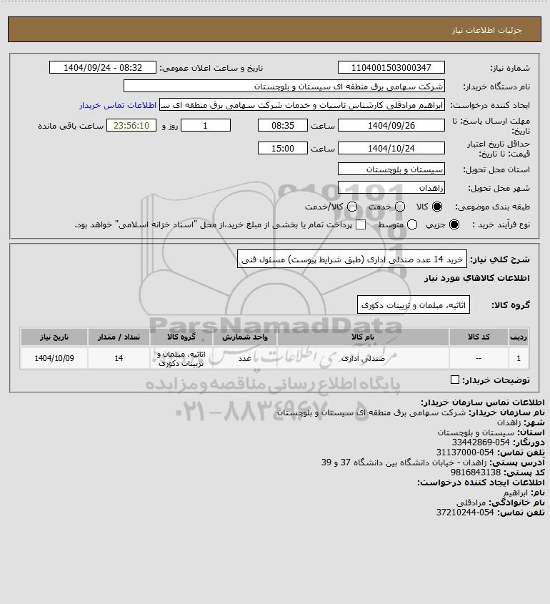 شرح کلی نیاز: خرید 14 عدد صندلی اداری (طبق شرایط پیوست)