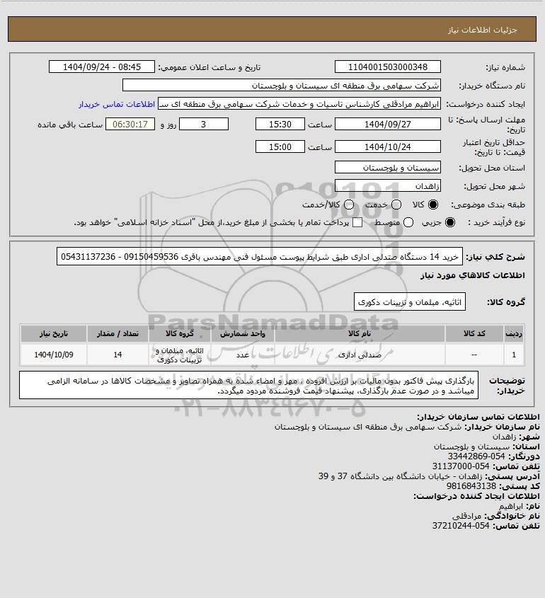 شرح کلی نیاز: خرید 14 دستگاه صتدلی اداری طبق شرایط پیوست