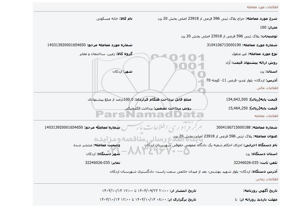 | عنوان معامله: پلاک ثبتی 596 فرعی از 23918 اصلی بخش 20 یزد | ||
