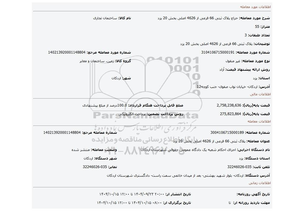 | شرح مورد معامله: حراج پلاک ثبتی 66 فرعی از 4626 اصلی بخش 20 یزد | نام کالا: ساختمان تجاری | |
