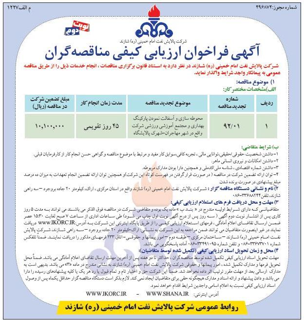 | 92.01 | محوطه سازی و آسفالت نمودن پارکینگ بهداری و مجتمع اموزشی ورزشی شرکت واقع در شهر مهاجران شهرک پالایشگاه | 45 روز تقویمی | 10.100.000 |