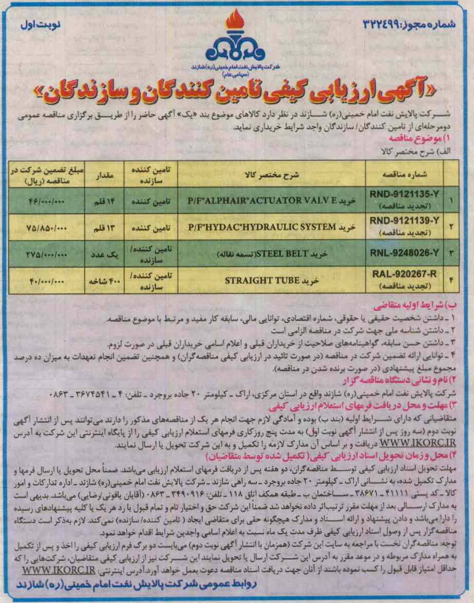 شرکت پالایش نفت امام خمینی ره شازند در نظر دارد کالاهای موضوع بند یک آگهی حاضر را از طریق برگزاری مناقصه عمومی دو مرحله ای از سازندگان واجد شرایط خریداری نماید