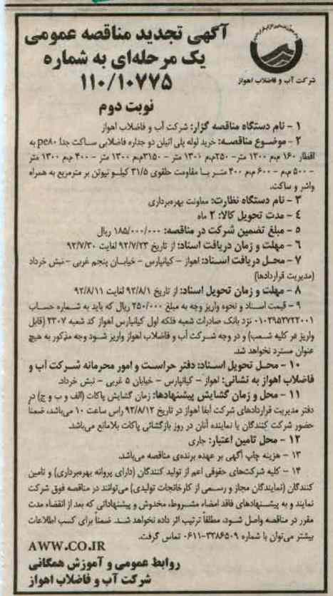آگهی تجدید مناقصه عمومی یک مرحله ای , خرید لوله پلی اتیلن دو جداره فاضلابی ساکت جدا pe80