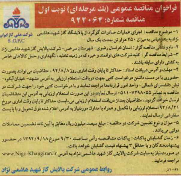 فراخوان مناقصه عمومی یک مرحله ای , اجرای عملیات صادرات گوگرد
