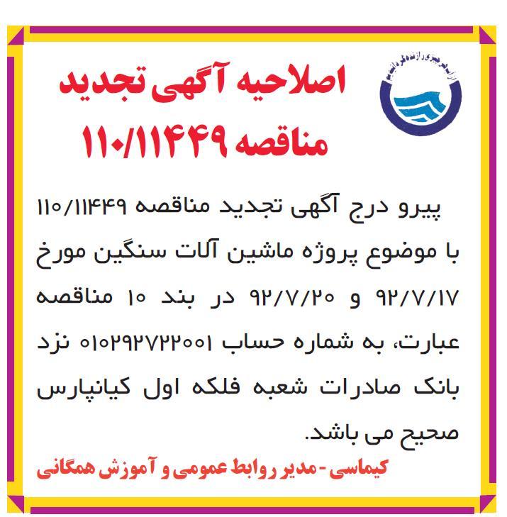 پیرو درج آگهی تجدید مناقصه 11449/110 با موضوع پروژه ماشین آلات سنگین مورخ 92.7.17 و 92.7.20 در بند 10 مناقصه عبارت به شماره حساب 010292722001 نزد بانک صادرات شعبه فلکه اول کیانپارس صحیح می باشد