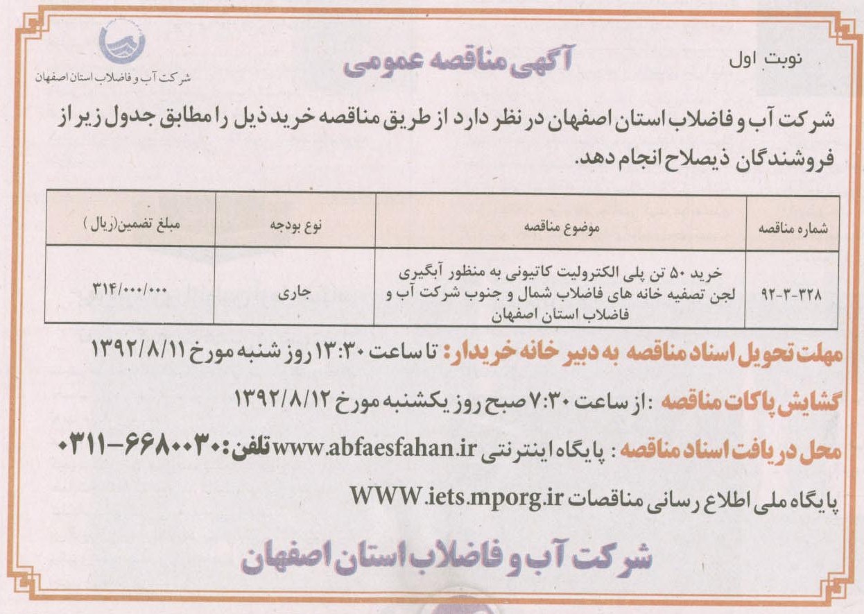 | 328-3-92 | خرید 50 تن پلی الکترولیت کاتیونی به منظور آبگیری لجن تصفیه خانه های فاضلاب شمال و جنوب شرکت آب و فاضلاب استان اصفهان | جاری | 314.000.000 |