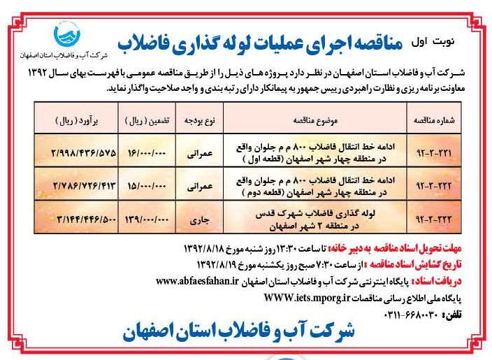 شرکت آب و فاضلاب استان اصفهان در نظر دارد پروژه های ذیل را از طریق مناقصه عمومی با فهرست بهای سال 1392 معاونت برنامه ریزی و نظارت راهبردی رییس جمهور به پیمانکار دارای رتبه بندی و واجد صلاحیت واگذار نماید