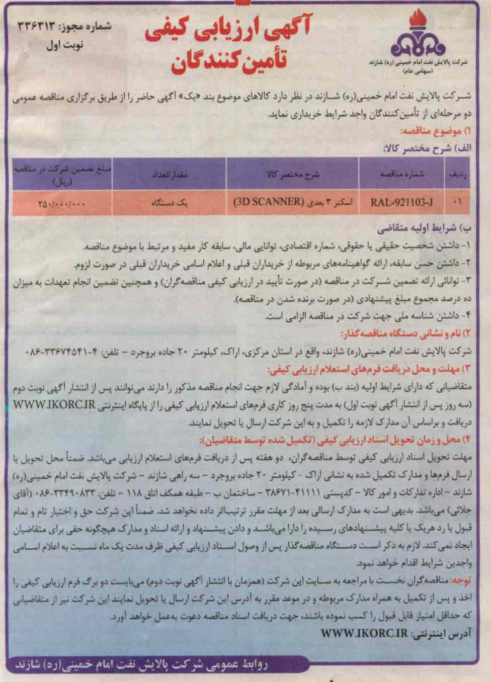 آگهی ارزیابی کیفی تامین کنندگان , خریداری اسکنر سه بعدی 3D SCANNER