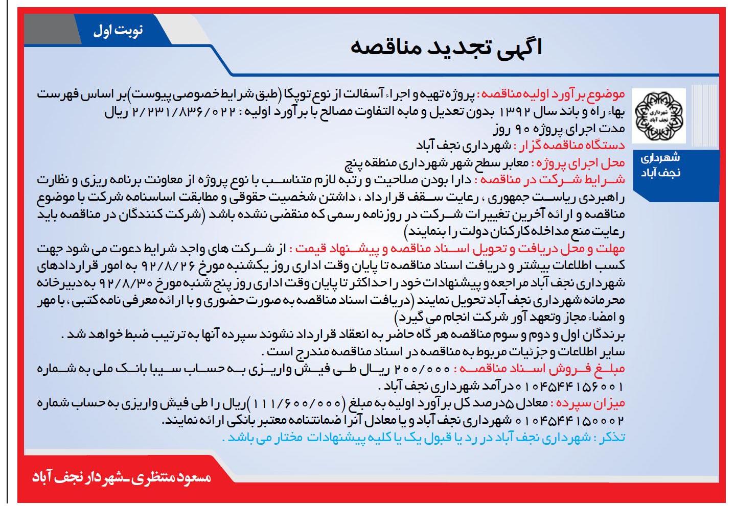 دستگاه مناقصه گزار شهرداری نجف آباد
