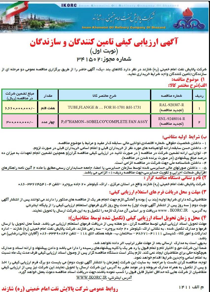 شرکت پالایش نفت امام خمینی ره شازند در نظر دارد کالاهای موضوع بند یک آگهی حاضر را از طریق برگزاری مناقصه عمومی دو مرحله ای از سازندگان و تامین کنندگان واجد شرایط خریداری نماید.