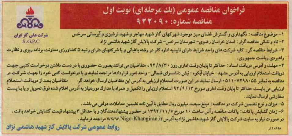 فراخوان مناقصه عمومی (یک مرحله ای) , نگهداری و گسترش فضای سبز موجود شهرکهای گاز شهید مهاجر و شهید ترشیزی و آبرسانی سرخس