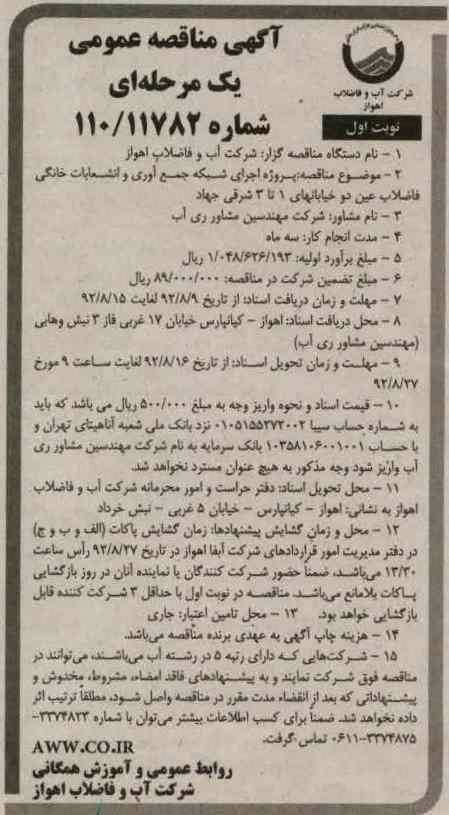 نام دستگاه مناقصه گزار: شرکت آب و فاضلاب اهواز
