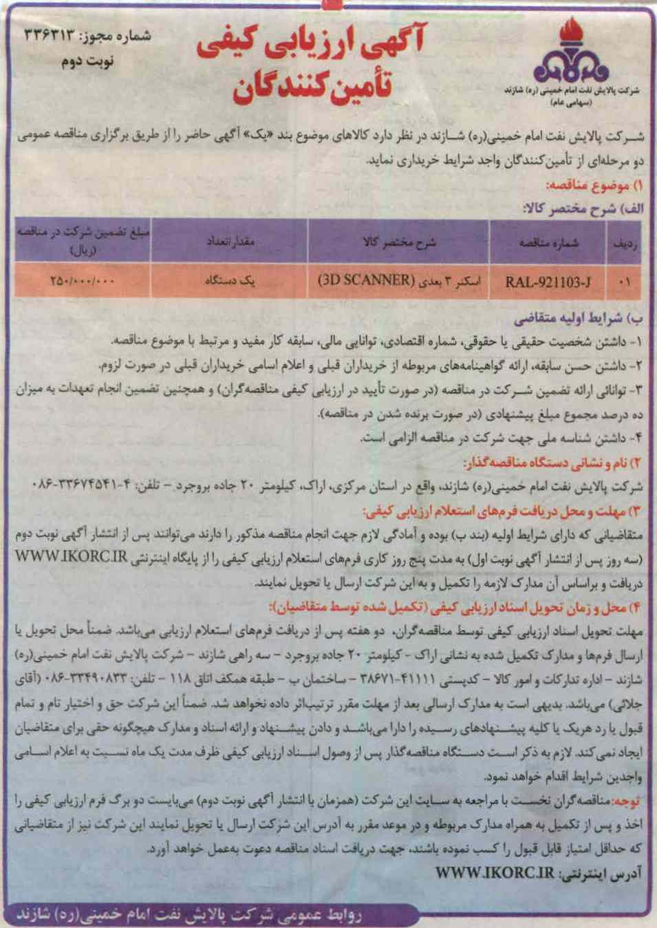 آگهی ارزیابی کیفی تامین کنندگان , خریداری اسکنر سه بعدی 3D SCANNER