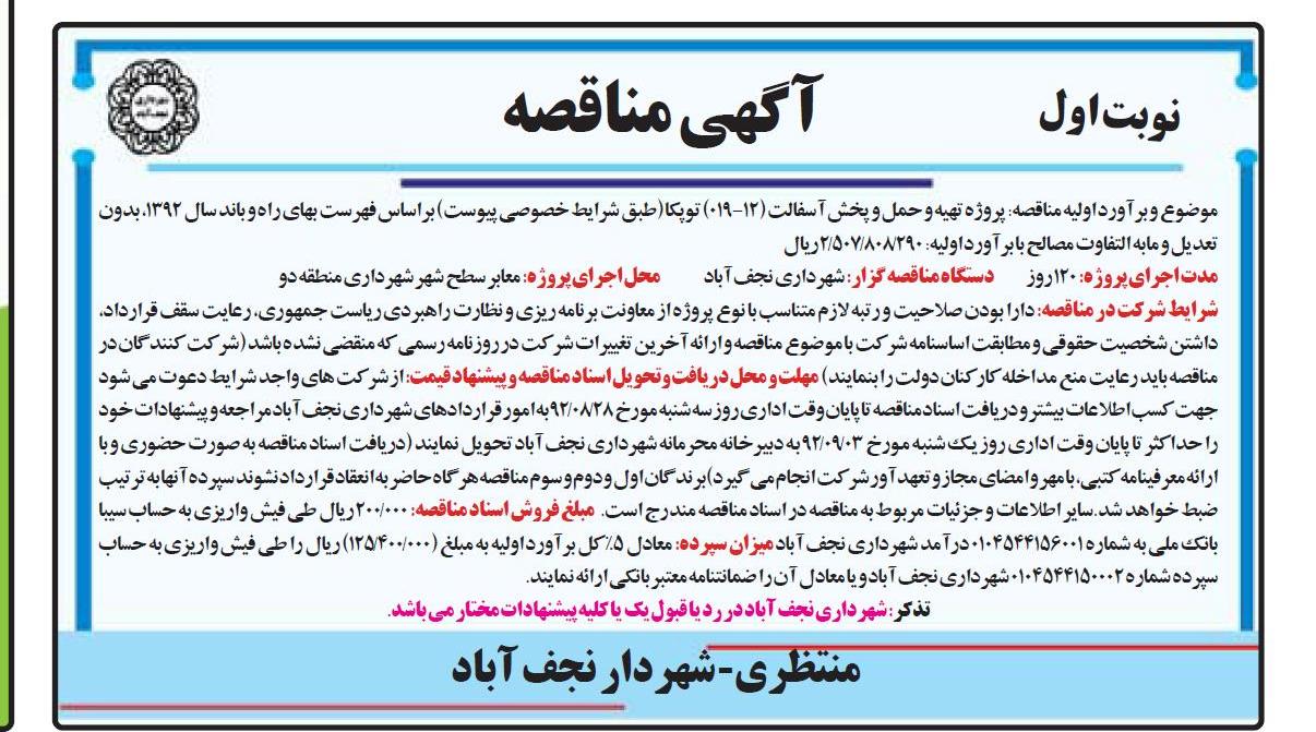 مهلت و محل دریافت و تحویل اسناد مناقصه و پیشنهاد قیمت از شرکتهای واجد شرایط دعوت میگردد جهت کسب اطلاعات بیشتر و دریافت اسناد مناقصه تا پایان وقت اداری روز سه شنبه 92.8.28 به امور قراردادهای شهرداری نجف آباد مراجعه و پیشنهادات خود را حداکثر تا پایان وقت اداری روز یکشنبه 92.9.3 به دبیرخانه محرمانه شهرداری نجف آباد تحویل نمایند دریافت اسناد به صورت حضوری و با ارائه معرفی نامه کتبی با مهر و امضا مجاز و تعهدآور شرکت انجام میگیرد برندگان اول و دوم و سوم مناقصه هرگاه حاضر به انعقاد قرارداد نشوند سپرده انها به ترتیب ضبط خواهد شد سایر اطلاعات و جزییات مربوط به مناقصه در اسناد مناقصه مندرج است مبلغ فروش اسناد مناقصه 200.000 ریال طی فیش واریزی به حساب سیبا بانک ملی به شماره 0104544156001 درامد شهرداری نجف آباد میزان سپرده معادل 5% کل برآورد اولیه به مبلغ 125.400.000 ریال را طی فیش واریزی به حساب شماره سپرده0104544150002 شهرداری نجف آباد و یا معادل انرا ضمانتنامه بانکی ارائه نمایند