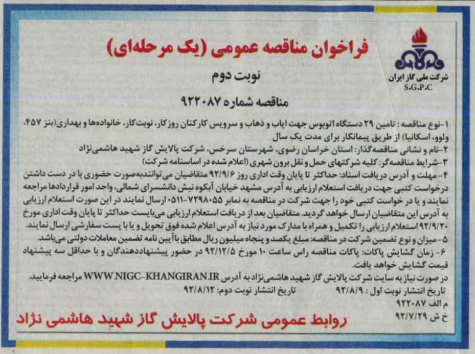 موضوع مناقصه: تامین 29 دستگاه اتوبوس جهت ایاب و ذهاب و سرویس کارکنان روزکار ، نوبت کار ، خانواده ها و بهداری (بنز 457، ولوو، اسکانیا) از طریق پیمانکار برای مدت یکسال