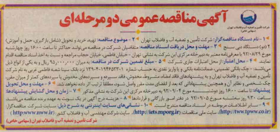 نام دستگاه مناقصه گزار: شرکت تامین و تصفیه آب و فاضلاب تهران