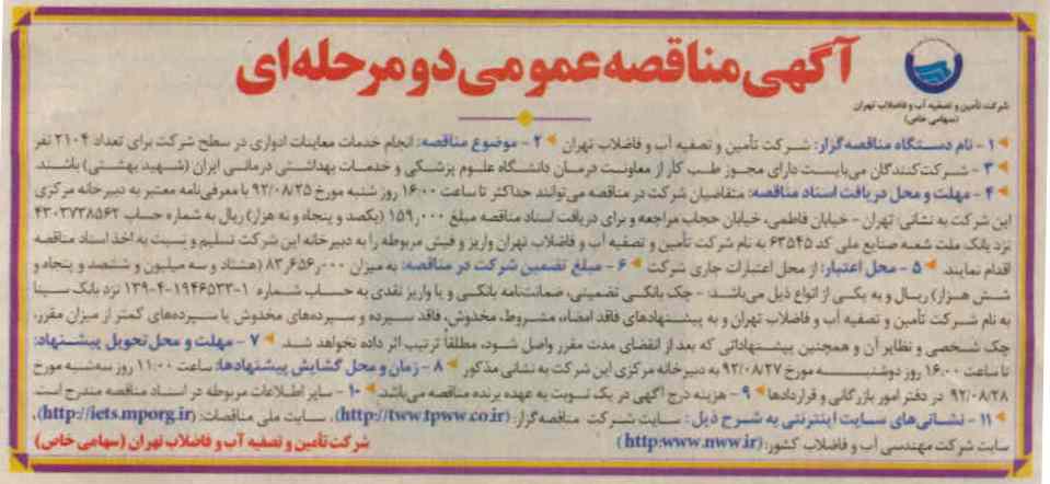 شرکت تامین و تصفیه آب و فاضلاب تهران (سهامی خاص)موضوع مناقصه: انجام خدمات معاینات ادواری در سطح شرکت برای تعداد 2104 نفر