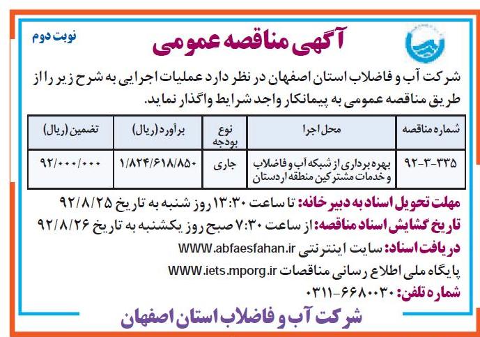 | 335-3-92 | بهره برداری از شبکه اب و فاضلاب و خدمات مشترکین منطقه اردستان |