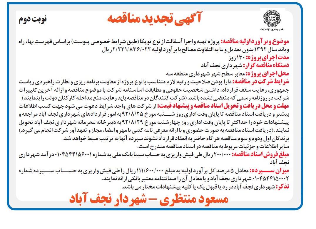 آگهی تجدید مناقصه, پروژه تهیه و اجرای آسفالت از نوع توپکا منطقه سه