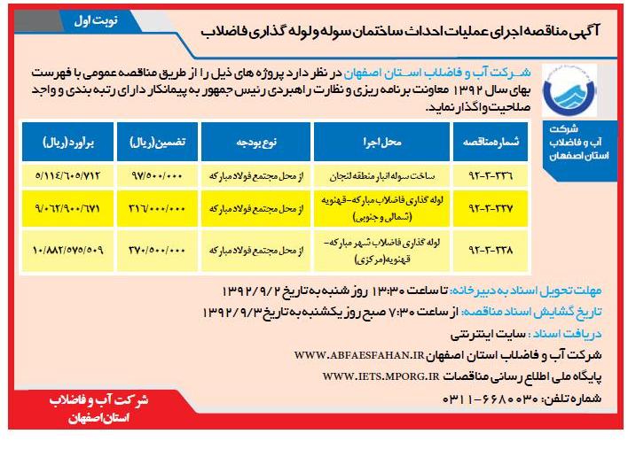 شرکت آب و فاضلاب استان اصفهان در نظر دارد پروژه های ذیل را از طریق مناقصه عمومی با فهرست بهای سال 92 معاونت برنامه ریزی و نظارت راهبردی رئیس جمهور به پیمانکار دارای رتبه بندی و واجد صلاحیت واگذار نماید.