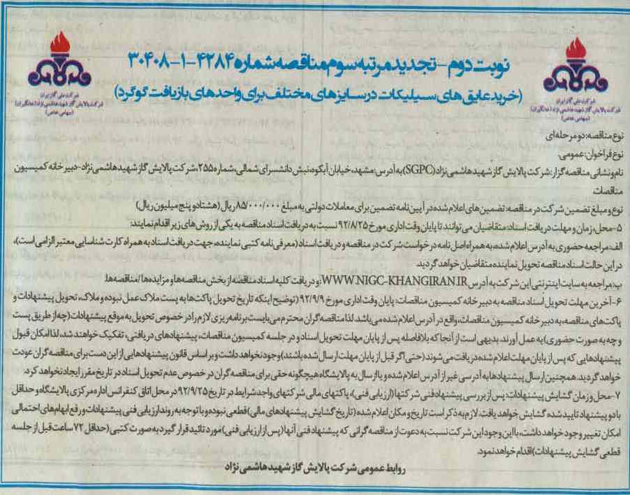 نام و نشانی مناقصه گذار: شرکت پالایش گاز شهید هاشمی نژاد SGPC به آدرس: مشهد ، خیابان آبکوه ، نبش دانشسرای شمالی ، شماره 255 ، شرکت پالایش گاز شهید هاشمی نژاد - دبیرخانه کمیسیون مناقصات