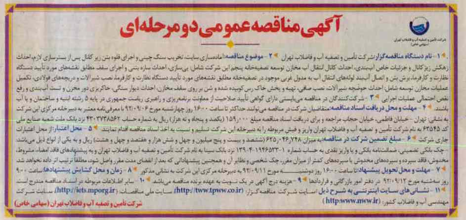 مهلت، محل تحویل اسناد مناقصه : متقاضیان شرکت در مناقصه می توانند حداکثر تا ساعت 16 روز چهارشنبه مورخ 92.9.6 با معرفی نامه معتبر به دبیرخانه مرکزی این شرکت به نشانی : تهران - خیابان فاطمی ، خیابان حجاب مراجعه و برای ردیافت اسناد مناقصه مبلغ 159.000 (یکصدوپنجاه هزار) ریال به حساب شماره 4303738562 نزد بانک ملت شعبه سازمان صنایع ملی کد 63545 به نام شرکت تامین و تصفیه آب و فاضلاب تهران، واریز و فیش مربوطه به دبیرخانه مرکزی این شرکت تسلیم و نسبت به اخذ اسناد مناقصه اقدام نمایند.