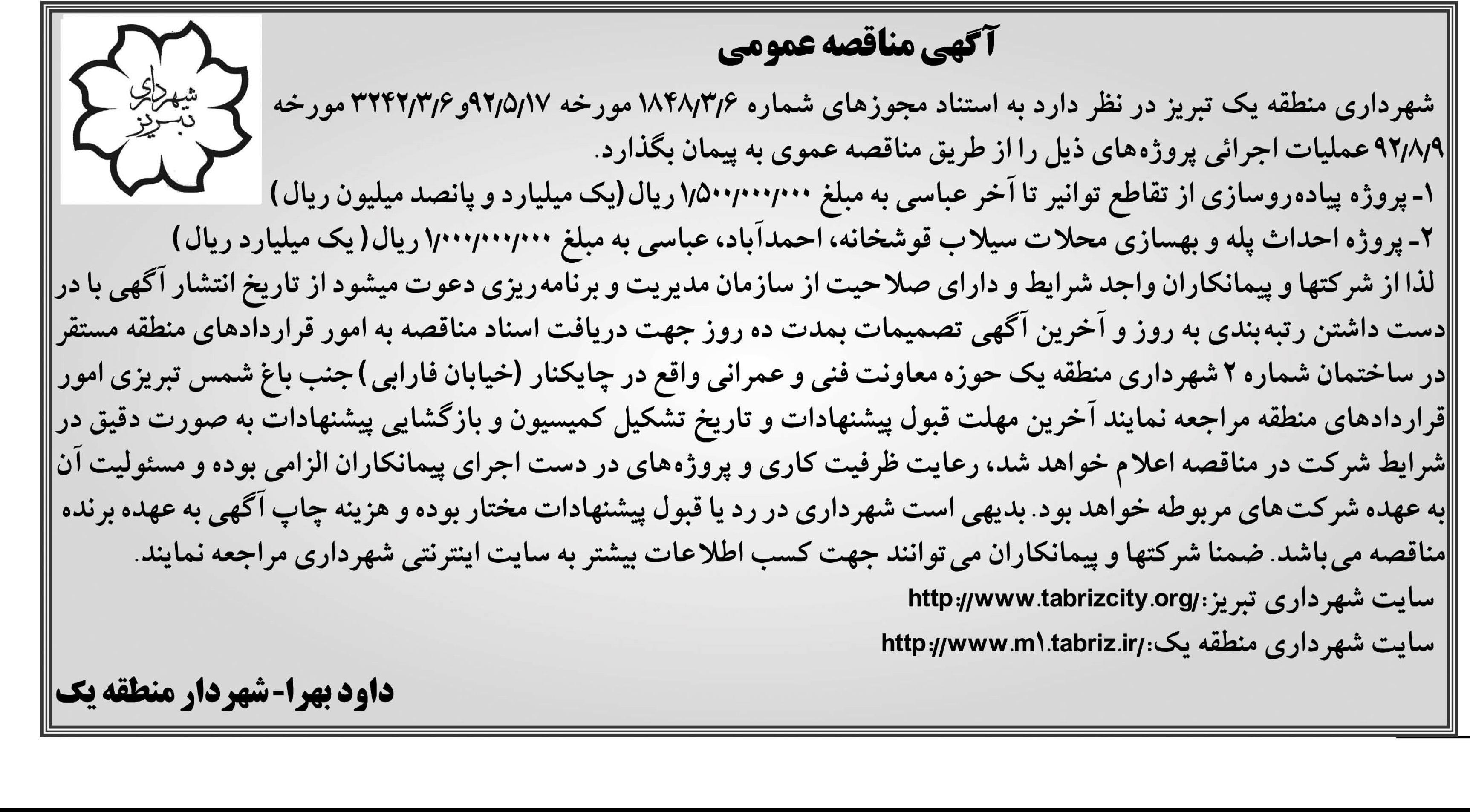 شهرداری منطقه یک تبریز در نظر دارد عملیات اجرایی پروژه های ذیل را از طریق مناقصه عمومی به پیمان بگذارد.