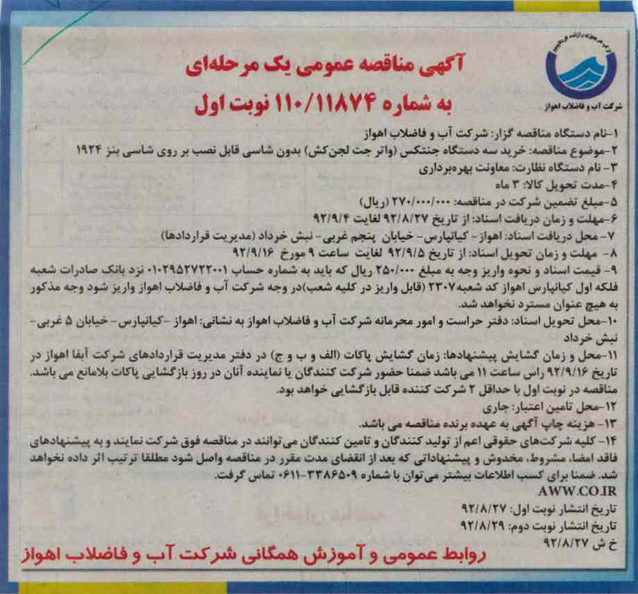 محل و زمان گشایش پیشنهادها: زمان گشایش پاکات الف و ب و ج در دفتر مدیریت قراردادهای شرکت آبفا اهواز در تاریخ 92.9.16 راس ساعت 11 می باشد ضمنا حضور شرکت کنندگان یا نماینده آنان در روز بازگشایی پاکات بلامانع می باشد مناقصه در نوبت اول با حداقل 2 شرکت کننده قابل بازگشایی خواهد بود
