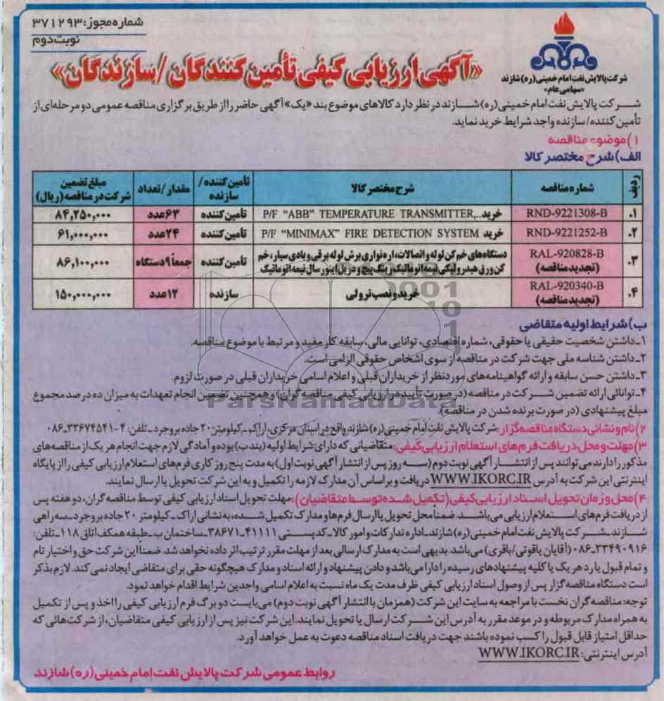 شرکت پالایش نفت امام خمینی ره شازند در نظر دارد کالاهای موضوع بند یک آگهی حاضر را از طریق برگزاری مناقصه عمومی دو مرحله ای از تامین کننده / سازنده واجد شرایط خرید نماید