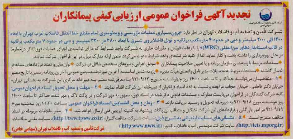 تجدید آگهی فراخوان عمومی ارزیابی کیفی پیمانکاران از کلیه افراد متخصص و شرکتها واجد شرایط دعوت به عمل میآید در مناقصه با کد خبرگزاری پارس نماد: 277662 شرکت نمایند.