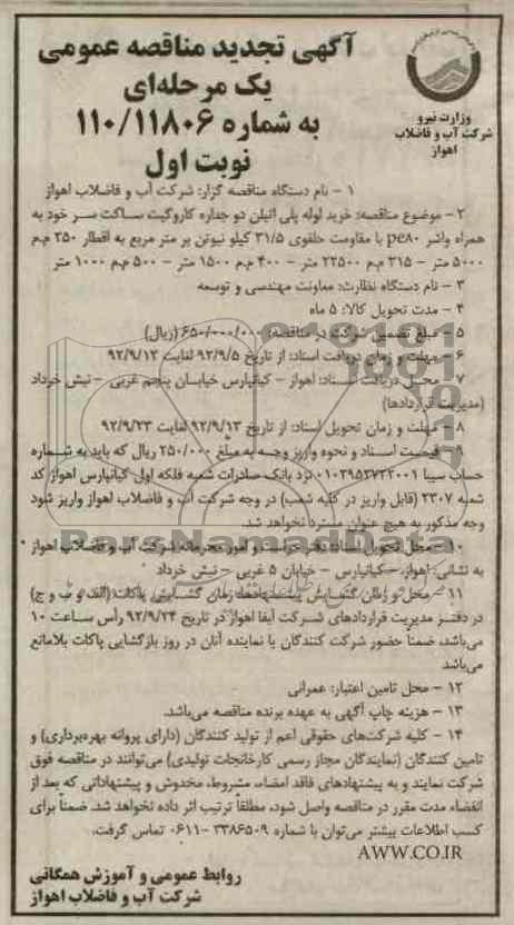 نام دستگاه مناقصه گذار: شرکت آب و فاضلاب اهواز