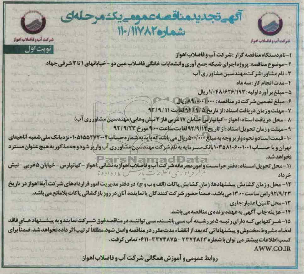 نام دستگاه مناقصه گزار: شرکت آب و فاضلاب اهواز