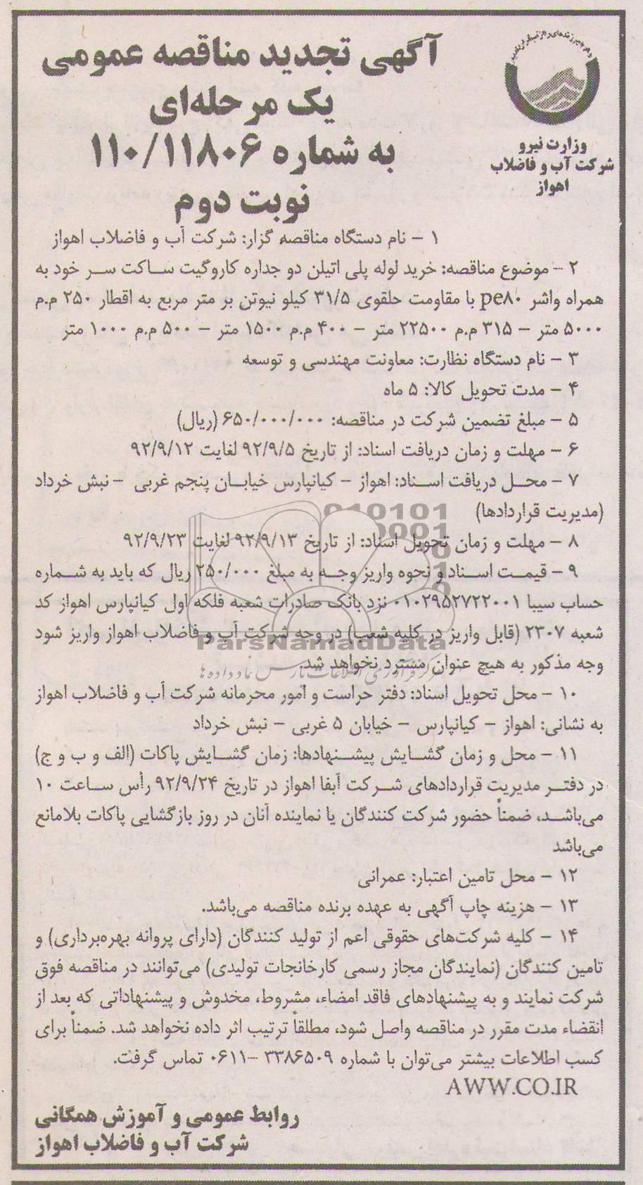 محل و زمان گشایش پیشنهادها: زمان گشایش پاکات الف و ب و ج در دفتر مدیریت قراردادهای شرکت آبفا اهواز در تاریخ 92.9.24 راس ساعت 10 می باشد ضمنا حضور شرکت کنندگان یا نماینده آنان در روز بازگشایی پاکات بلامانع می باشد مناقصه در نوبت اول با حداقل 2 شرکت کننده قابل بازگشایی خواهد بود