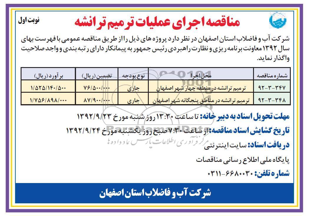شرکت آب و فاضلاب استان اصفهان در نظر دارد پروژه های ذیل را از طریق مناقصه عمومی با فهرست بهای سال 1392 معاونت برنامه ریزی و نظارت راهبردی رئیس جمهور به پیمانکار دارای رتبه بندی و واجد صلاحیت واگذار نماید