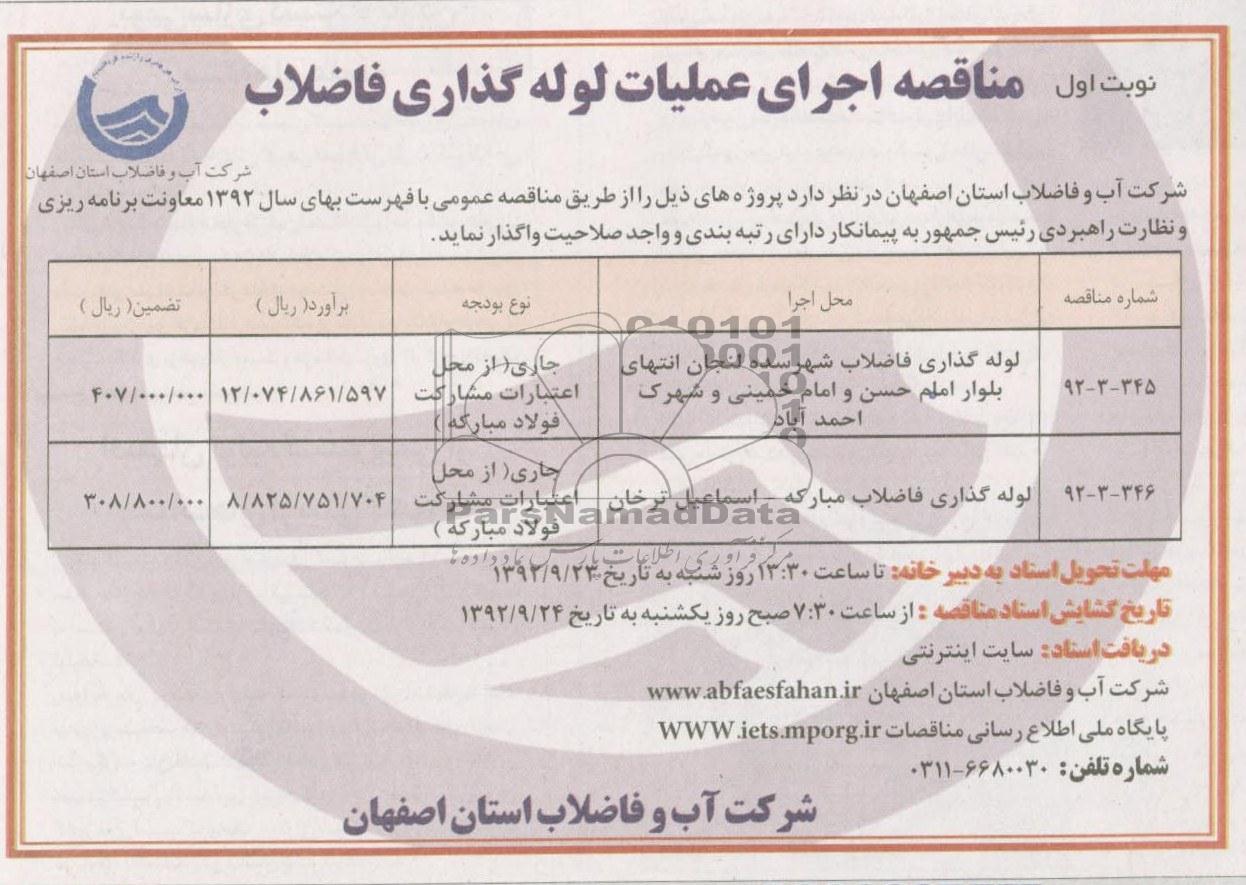 شرکت آب و فاضلاب استان اصفهان در نظر دارد پروژه های ذیل رااز طریق مناقصه عمومی با فهرست بهای سال 1392 معاونت برنامه ریزی و نظارت راهبردی رئیس جمهور به پیمانکار دارای رتبه بندی و واجد صلاحیت واگذار نماید.