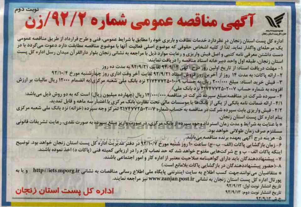 اداره کل پست استان زنجان در نظر دارد مطابق با شرایط عمومی و فنی و طرح قرارداد خدمات نظافت و باربری خود را از طریق مناقصه عمومی یک مرحله ای واگذار نماید.