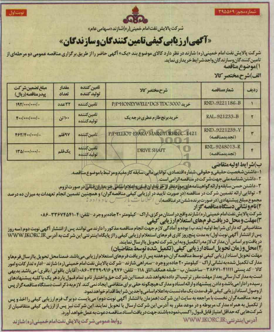 شرکت پالایش نفت امام خمینی (ره) شازند در نظر دارد کالاهای موضوع بند یک آگهی حاضر را از طریق برگزاری مناقصه عمومی دو مرحله ای از تامین کنندگان / سازنده واجد شرایط خریداری نماید.