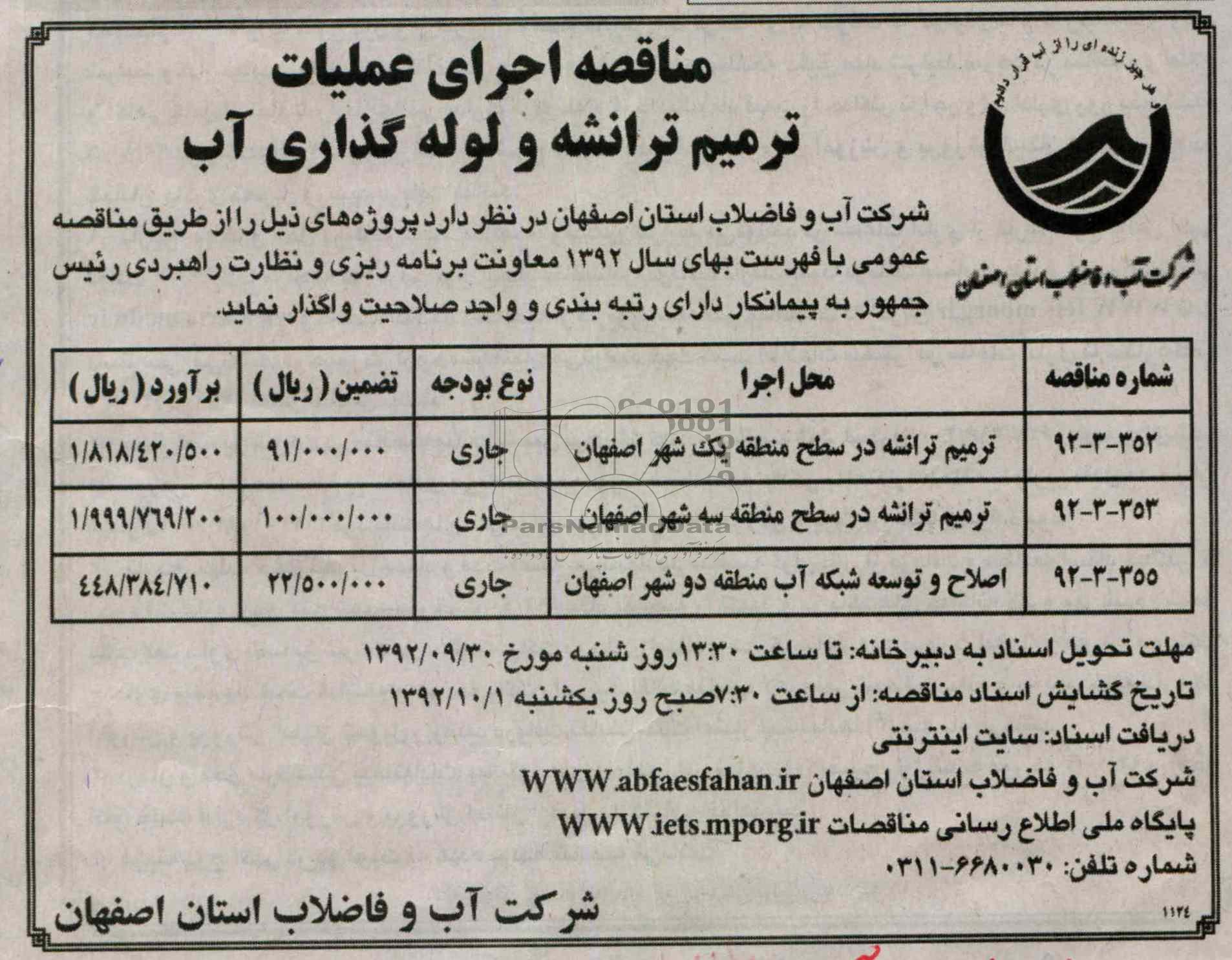 | 92-3-353 | ترمیم ترانشه در سطح منطقه سه شهر اصفهان | جاری | 100.000.000 | 1.999.769.200 |