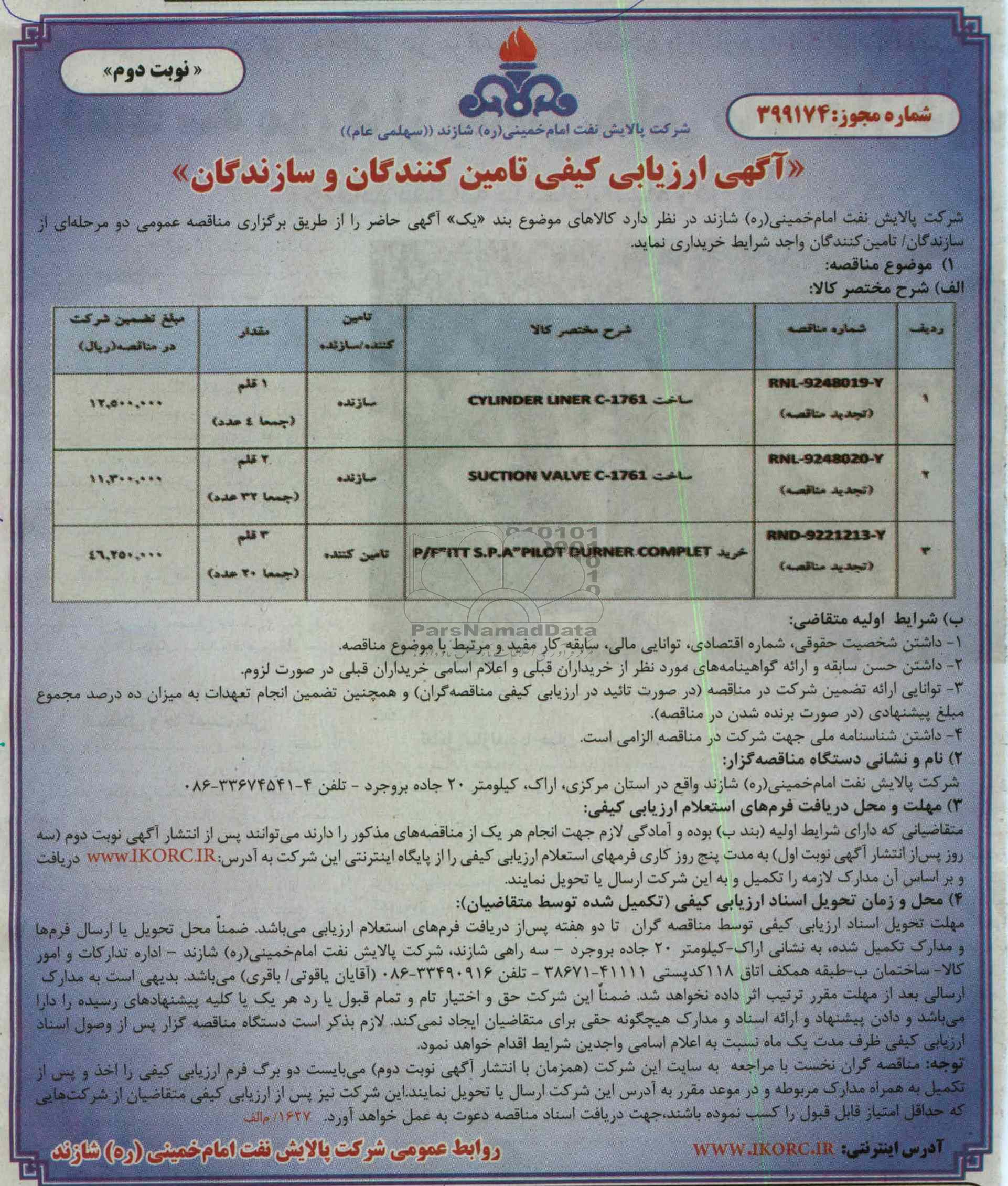 شرکت پالایش نفت امام خمینی (ره) شازند در نظر دارد کالاهای موضوع بند یک آگهی حاضر را از طریق برگزاری مناقصه عمومی دو مرحله ای از تامین کنندگان / سازنده واجد شرایط خریداری نماید.