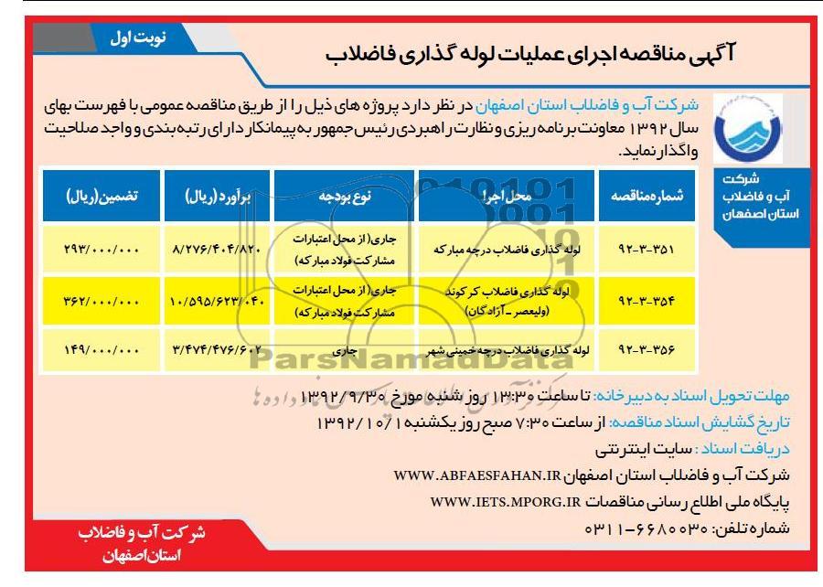 شرکت آب و فاضلاب استان اصفهان در نظر دارد پروژه های ذیل رااز طریق مناقصه عمومی با فهرست بهای سال 1392 معاونت برنامه ریزی و نظارت راهبردی رئیس جمهور به پیمانکار دارای رتبه بندی و واجد صلاحیت واگذار نماید.