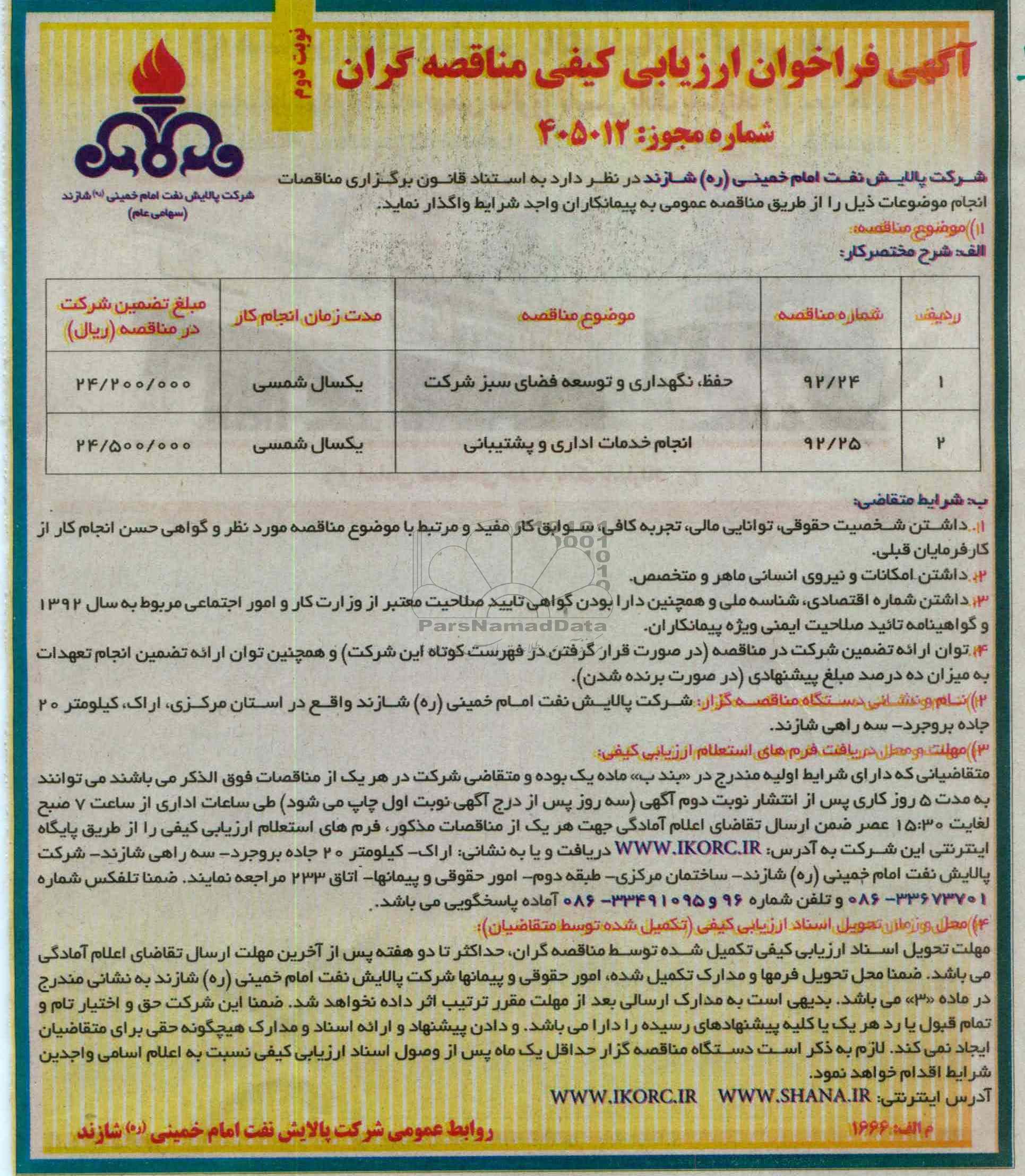 | 24/92 | حفظ ، نگهداری و توسعه فضای سبز شرکت | یکسال شمسی | 24.200.000 |
