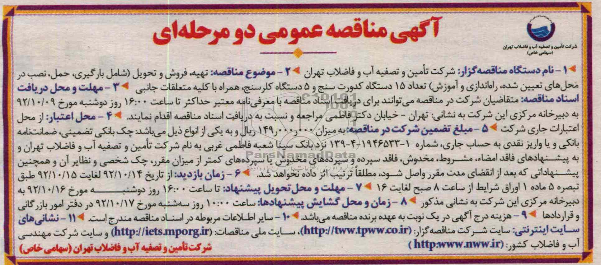 موضوع مناقصه: تهیه ، فروش و تحویل (شامل بارگیری ، حمل ، نصب در محل های تعیین شده ، راه اندازی و آموزش) تعداد 15 دستگاه کدورت سنج و 5 دستگاه کلرسنج ، همراه با کلیه متعلقات جانبی