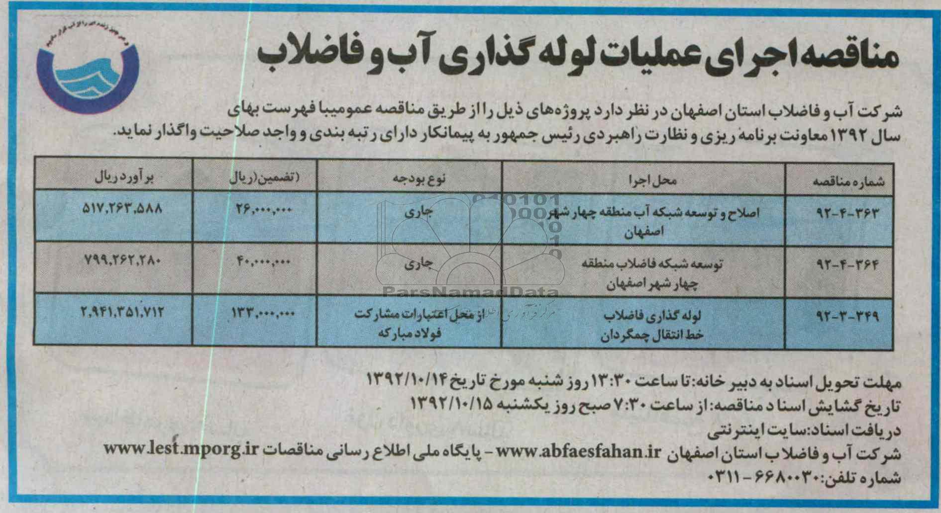 شرکت آب و فاضلاب استان اصفهان در نظر دارد پروژه های ذیل رااز طریق مناقصه عمومی با فهرست بهای سال 1392 معاونت برنامه ریزی و نظارت راهبردی رئیس جمهور به پیمانکار دارای رتبه بندی و واجد صلاحیت واگذار نماید.