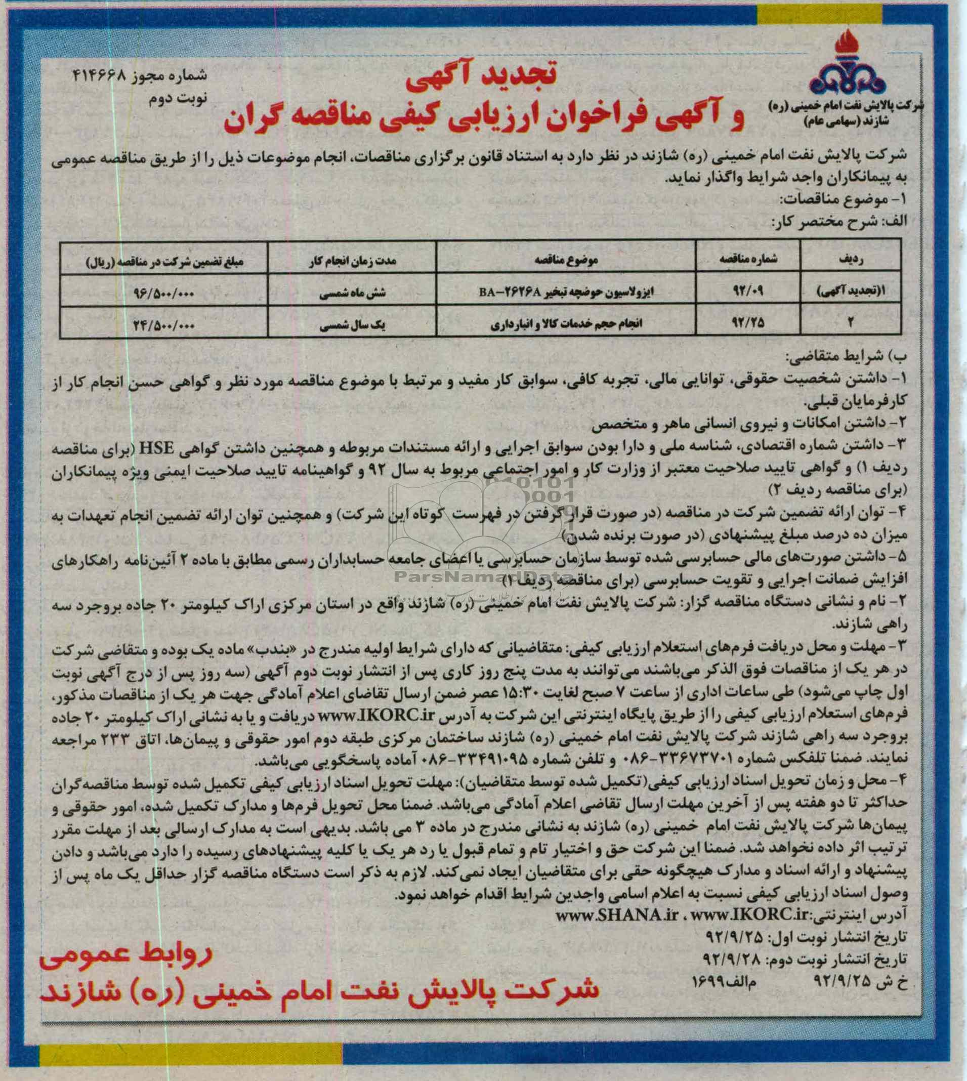 شماره مناقصه: 09/92 - تجدید آگهی موضوع مناقصه : ایزولاسیون حوضچه تبخیر BA-2626A - مدت زمان انجام کار: شش ماه شمسی - مبلغ تضمین شرکت در مناقصه (ریال): 96.500.000