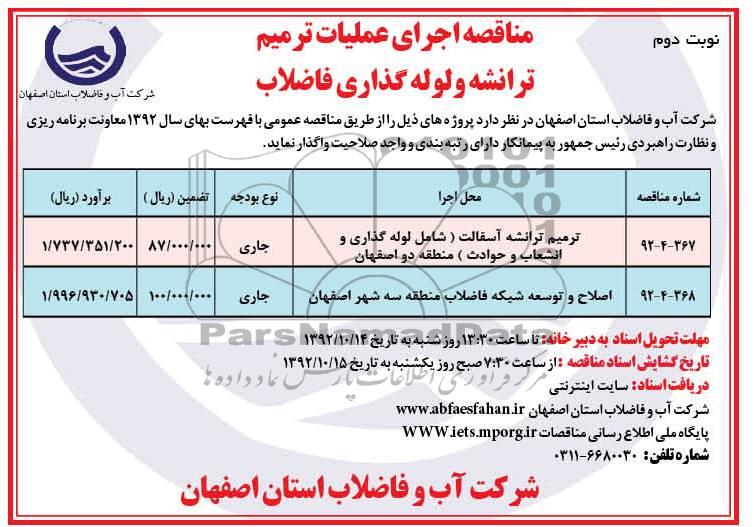 | 92-4-368 | اصلاح و توسعه شبکه فاضلاب منطقه سه شهر اصفهان | جاری | 100.000.000 | 1.996.930.705 |