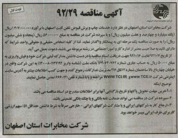شرکت مخابرات استان اصفهان در نظر دارد خدمات چاپ و برش قبوض تلفن ثابت اصفهان با برآورد 1.407.000.000 ریال یک میلیارد و چهارصد و هفت میلیون ریال و با سپرده شرکت در مناقصه به مبلغ 56.000.000 ریال پنجاه و شش میلیون ریال را به صورت مناقصه یک مرحله ای به پیمانکار واگذار نماید