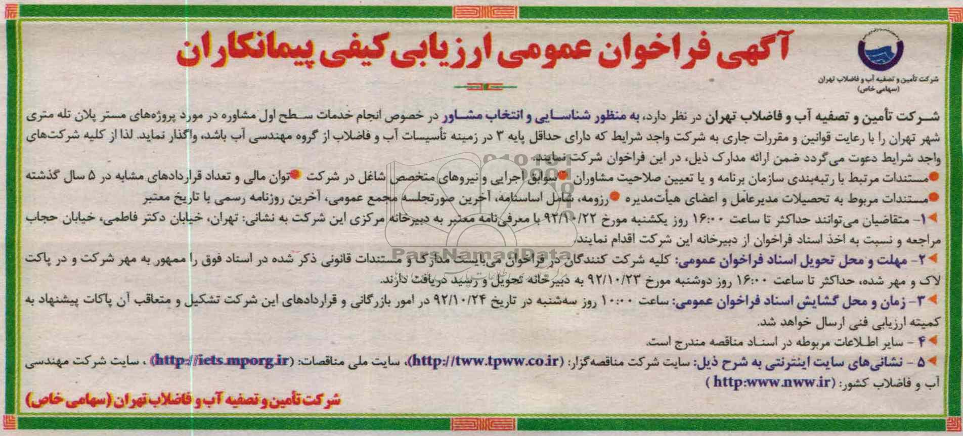 زمان و محل گشایش اسناد فراخوان عمومی : ساعت 10 روز سه شنبه در تاریخ 92.10.24 در امور بازرگانی و قراردادهای این شرکت تشکیل و متعاقب آن پاکات پیشنهاد به کمیته ارزیابی فنی ارسال خواهد شد.