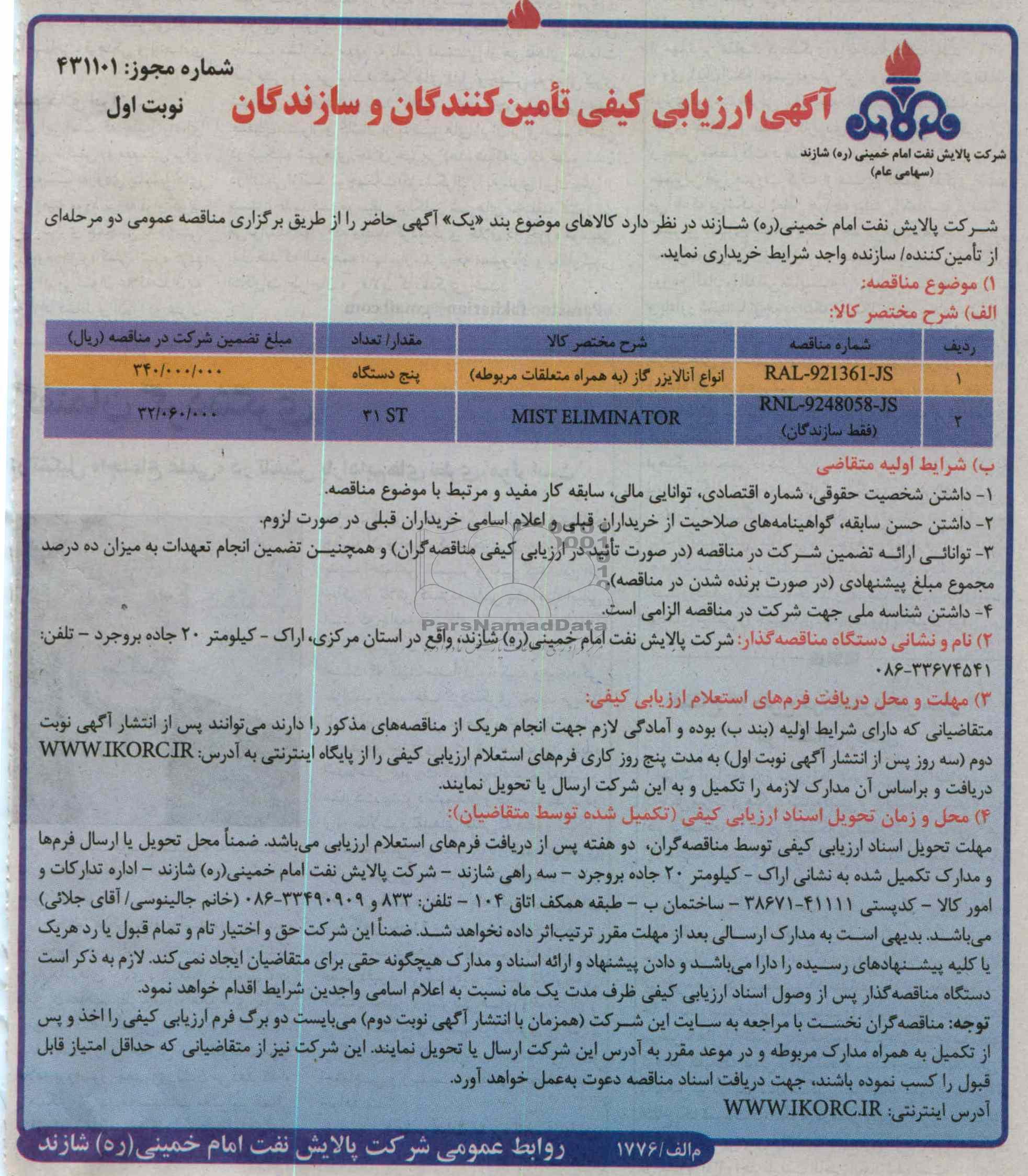 شرکت پالایش نفت امام خمینی (ره) شازند در نظر دارد کالاهای موضوع بند یک آگهی حاضر را از طریق برگزاری مناقصه عمومی دو مرحله ای از تامین کننده/ سازنده واجد شرایط خریداری نماید.