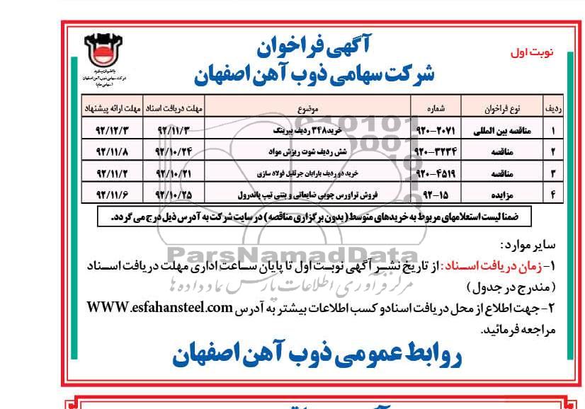 | مناقصه | 3234-920 | شش ردیف شوت ریزش مواد | 92.10.24 | 92.11.8 |
