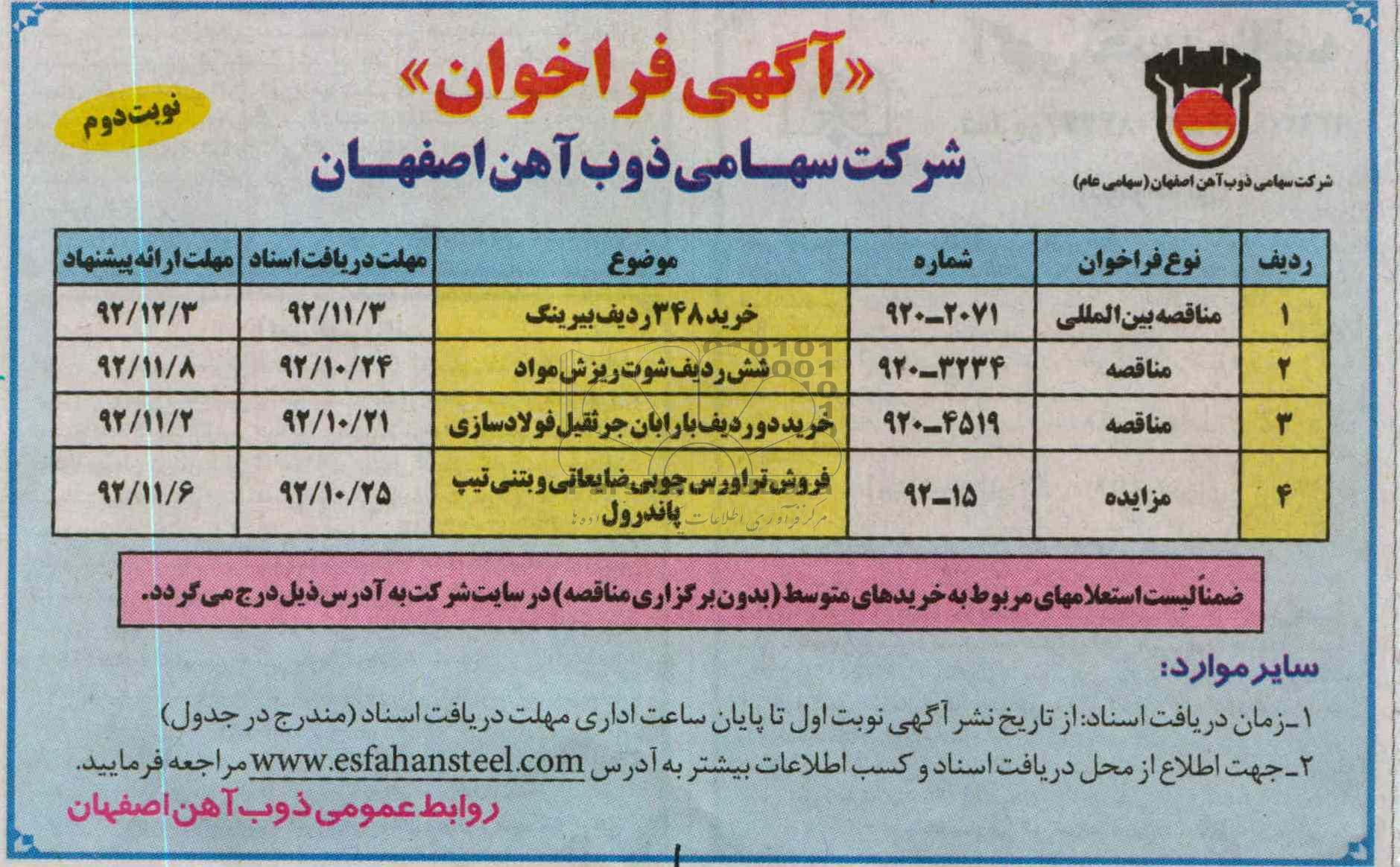 | مناقصه | 3234-920 | شش ردیف شوت ریزش مواد | 92.10.24 | 92.11.8 |
